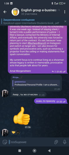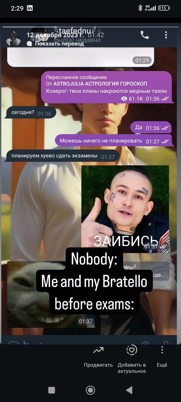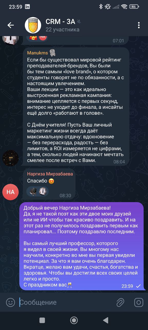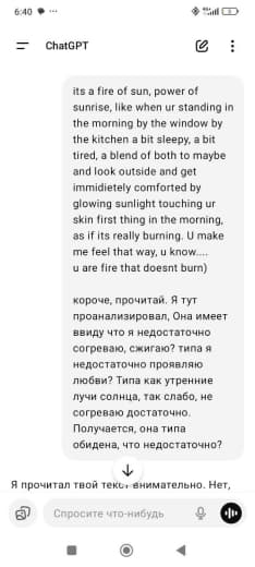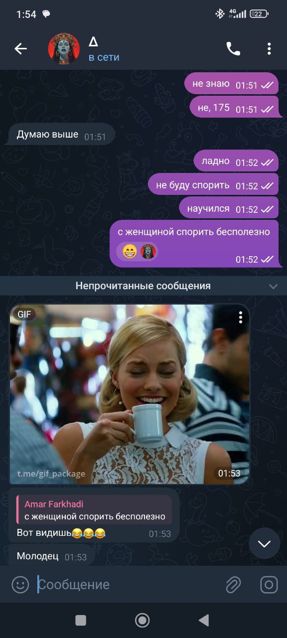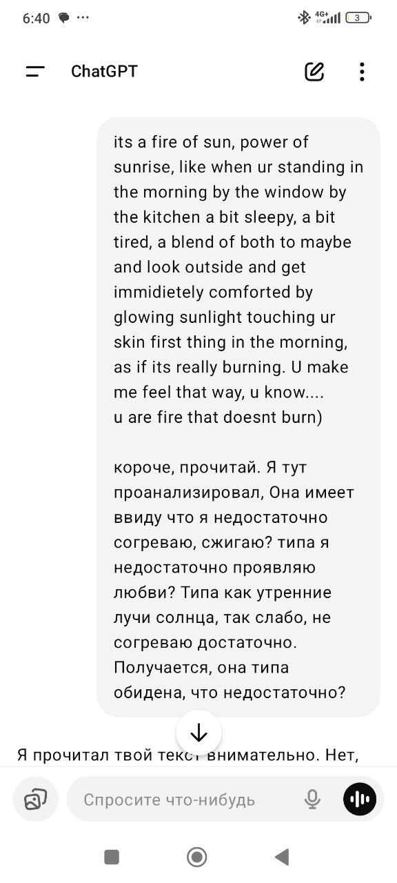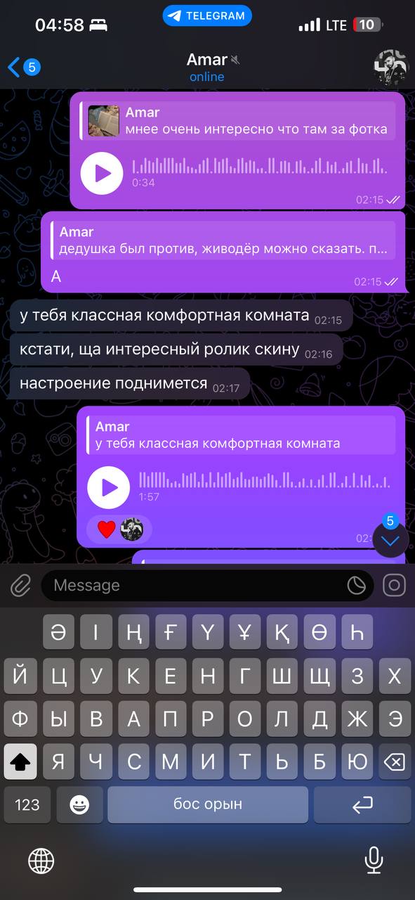 В момент первой нашей встречи моему мозгу хватило пару минут, чтобы понять что ты любовь всей моей жизни, просто он не сказал мне, скрыл... Чтобы я сам пришёл к этому, догадался... через время. Сам факт что ты уже в 17 лет, взяла IELTS 8.5 уже говорит о многом. Ты ещё и учителем была. Ещё тогда я понимал, что в роли спутницы мне нужна женщина с достижениями, чтобы и я не переставал расти, деградировать. Я лично был просто в восторге от нашего первого знакомства, и мой мозг тогда кричал мне "Амар, чтобы ни было, не упусти эту девчонку!" Но я просто этого не показывал, чтобы ты не зазналась)
