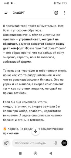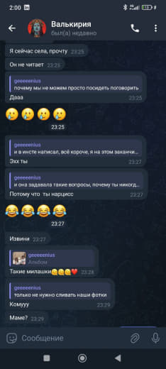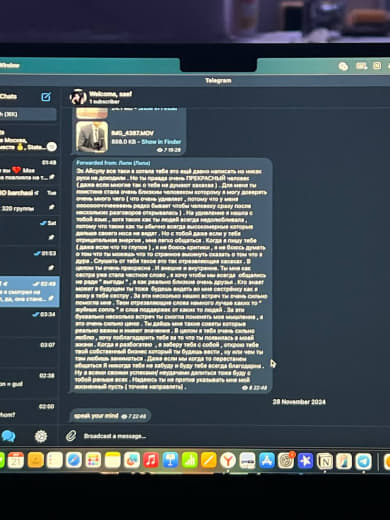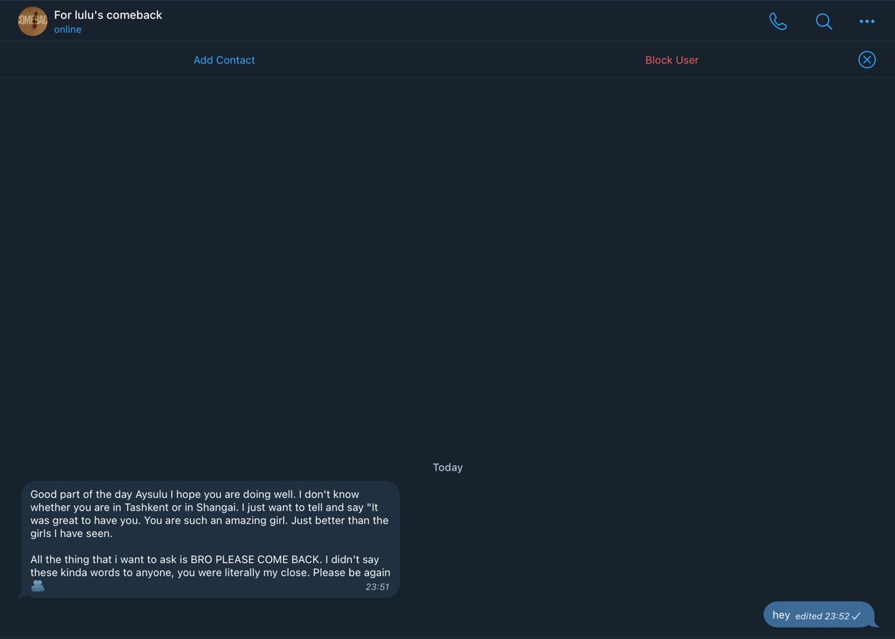 Знаешь, в момент когда ты меня заблокировала, одна часть моего мозга сказал, "Всё нормально, не бегай за девчонкой. В этой жизни ещё со многими познакомишься". Но в этот момент другая часть прошептала "А повезёт ли тебе так снова? Не купишься ли ты на фейковую внешность современных Барби кукол? Ведь она, она терпела твоё... Ой то есть наше ( я от лица нашего, то есть моего мозга пишу) скотное отношение. Она терпела наше детское поведение..."